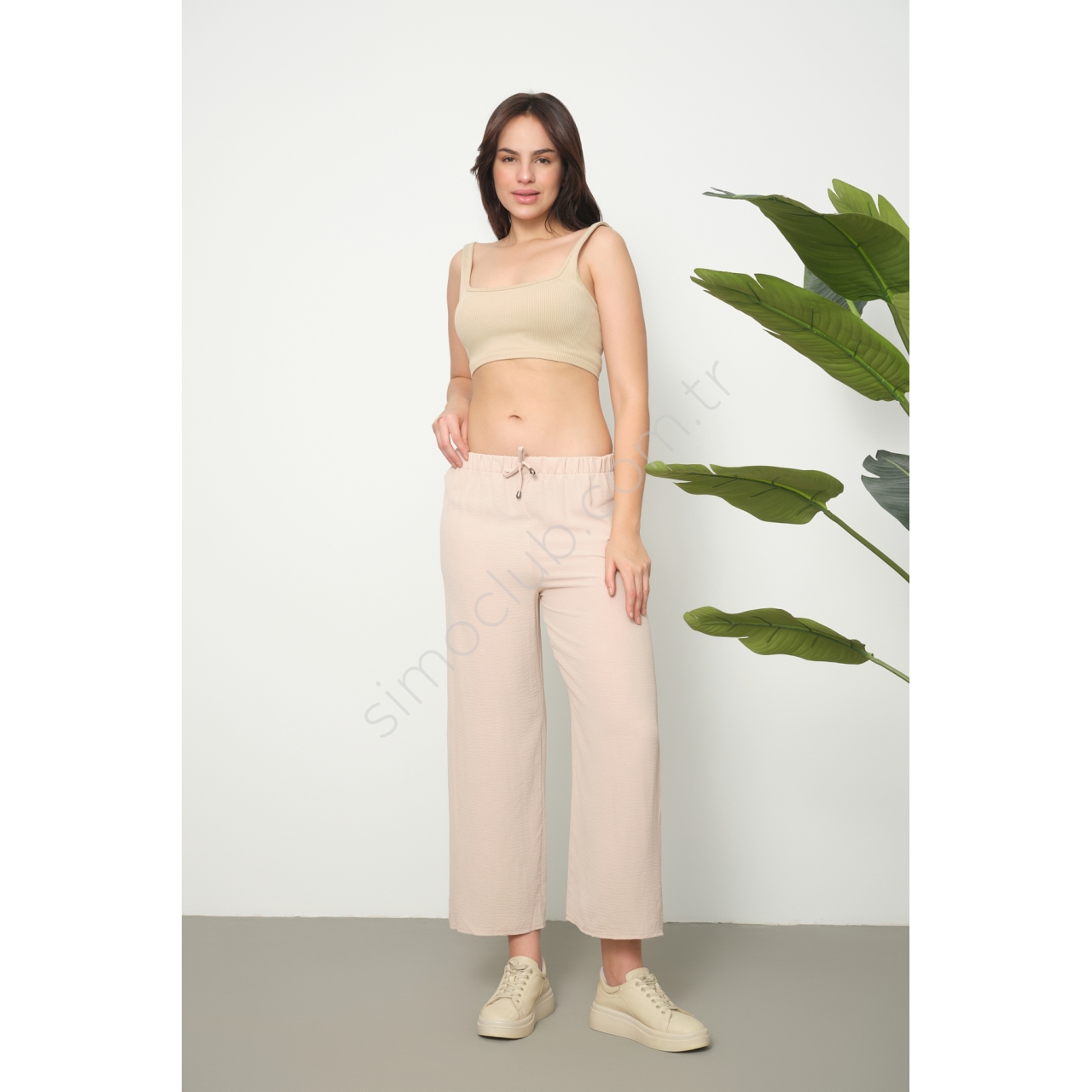 Rahat kalıbıyla gün boyu konfor sunan kadın lastikli ayrobin pantolon, tüm yaş grupları için uygundur. Polyester karışımlı kumaşı sayesinde hafif ve ince yapısıyla yaz ayları için idealdir. Düz deseniyle sade ve şık bir görünüm sağlar günlük kullanıma uygundur. Geniş paçaları sayesinde modern ve trend bir stil oluşturmanıza olanak tanır. Beli lastikli tasarımı sayesinde kolayca giyilip çıkarılabilir ve vücuda mükemmel uyum sağlar. Lastikli ayrobin pantolon, geniş paça kesimiyle rahat hareket etme olan